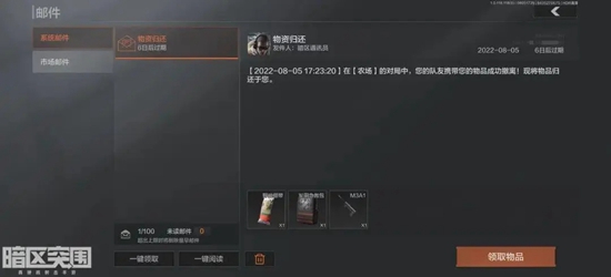 暗区突围物资归还机制。在暗区突围中,玩家们如果是自己一个人单枪匹马地进行游玩,并且想要带着物资全身而退的话,确实是一件难事,因为玩家们不知道什么时候就会被其他玩家给消灭,或者是路上遭遇老六的埋伏等等。