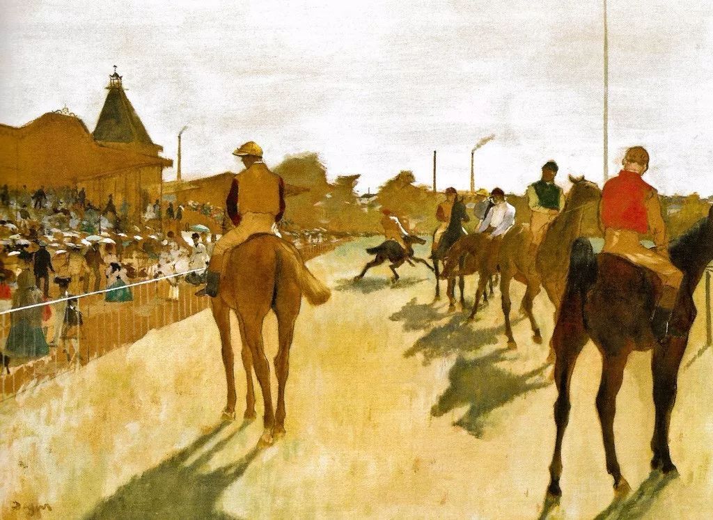 从1862年起,德加开始对赛马发生兴趣,这给他提供了一些多少总算比较完整的题材。19世纪60年代中期,德加受到印象派的影响,并成为印象派的重要成员。由于他早年深受古典主义绘画的影响,有坚实的素描功底,尤其擅长线条的运用。他将传统的素描同印象派的色彩绝妙的结合起来,成为印象派中善于运用线条的色彩画家。他最著名的绘画题材包括芭蕾舞演员和其他女性、以及赛马。
