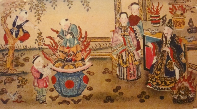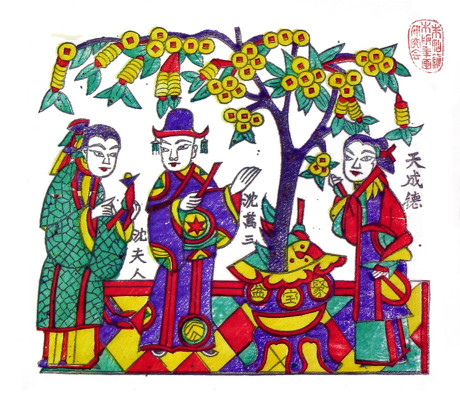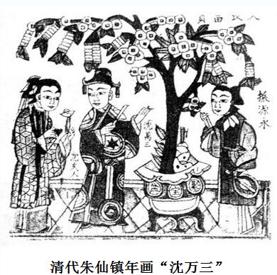 清代朱仙镇以沈万三故事为题材的门画,也有“摇钱树”画面。(沈万三是明代巨富。王世贞《国朝丛记》说,“大豪沈万三伏法,高皇帝籍没其家,所漏赀尚富。”)画面可见沈万三和沈夫人及一女侍在观赏聚宝盆中的“摇钱树”。沈万三的衣服,竟然也是以钱文为图案。