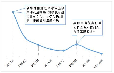 10月3日上午,新华社官方微博@新华视点发布报道《税务部门依法查处范冰冰“阴阳合同”等偷逃税问题》,指出范冰冰确以拆分合同手段偷逃税款,其担任法定代表人的企业也存在少缴税款情况,被依法责令缴纳税款、滞纳金、罚款超8.83亿元。消息一经发布,迅速引发“中国新闻网”“法制网”“中华网”等多家媒体转载报道和网民聚焦。当日中午,范冰冰通过其微博账号@范冰冰发表致歉信,舆论随之进一步发酵升级,助推舆情达到传播最高峰。