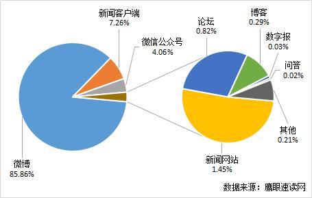 新闻客户端的占比虽然较小,但在此次事件中充分展示着新媒体的快速有效传播优势,在传播平台中位居第二位。“天天快报”“今日头条”“搜狐新闻”等客户端在事件发生后迅速发布、转载相关信息,以惊人的速度聚拢传统媒体内容,再加上这些平台下所进驻的娱乐、财经等不同领域的自媒体,围绕事件发表相关评论性文章表达自身观点,进一步促进了舆情信息量在该平台的增长。