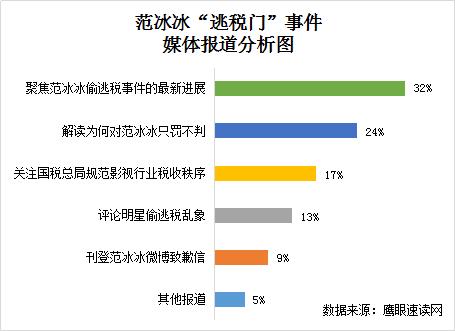 24%的媒体报道解读为何对范冰冰只罚不判,“新华社”《中国日报》《法制日报》等分别发表题为《范冰冰案教育警示文艺影视从业者遵纪守法》《为什么空姐代购逃税被判刑,范冰冰却只用交罚款?》《法制日报详解范冰冰偷逃税问题中法律热点:只有讲明白,法律才会避免误解得到支持》的报道,此类报道中根据《中华人民共和国刑法》《中华人民共和国税收征收管理法》等相关条例,从专业角度解读为何对范冰冰处以行政处罚而没有追究刑事责任。