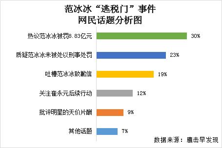 范冰冰“逃税门”事件,从崔永元曝光“阴阳合同”伊始到公布对范冰冰处罚决定,都引发大量网民的关注和讨论,30%的网民言论热议范冰冰被罚8.83亿元,相继出现了“范冰冰偷逃税8亿”“八个亿是什么概念”等微博话题。部分网民支持这一处罚决定,认为明星是公众人物,更应该依法纳税。法网恢恢,做错了就应该罚。另外,也有不少网民对于罚款数额之多表示震惊,微博用户@小螺号滴滴地吹__发表博文称,一辈子活100岁,年薪20万,9个亿需要赚45辈子,45辈子就是4500岁,也就是说你要从三皇五帝时期开始赚到现在。