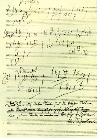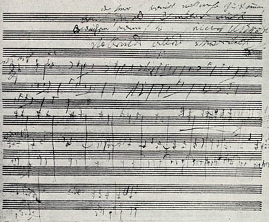 当他真切地感觉到自己的耳朵越来越聋时,他几乎绝望了。人生似乎不值得活下去了:对一个音乐家来说,还有比听不见他喜欢听而且靠它生活的甜美声音更不幸的事情吗!起初,只有威格勒医生和斯蒂芬.冯.勃罗伊宁等几个老朋友知道他的不幸。他放弃到各王宫去听他如此喜爱的欢快的音乐会,他怕人们注意到他的耳聋,以为一个听不见声音的音乐家是写不出好作品来的。不!他想起他想写的一切音乐,“我要扼住命运的喉咙!”也许对他来说,在耳聋的时候创作音乐并没有别的音乐家那么难。在他看来,音乐不仅是用迷人的声音安排各种主题或音型,它也是表现最深刻的思想的一种语言。