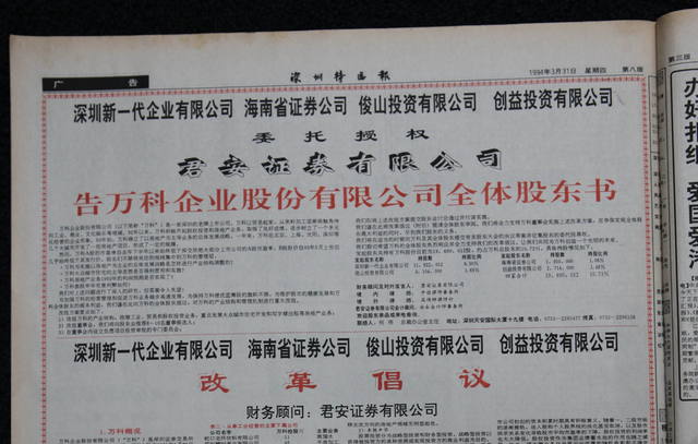 《深圳特区报》全版刊载《告万科企业股份有限公司全体股东书》;而在同一张报纸上刊载张西甫宣告新一代退出倡议的声明。