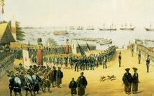 1853年7月8日,“黑船事件”发生。美国东印度舰队佩里准将率领4艘战舰驶入日本江户湾前,用武力威胁日本幕府停止“闭关锁国”的政策。佩里要求幕府接受美国总统米勒德·菲尔莫尔致“日本皇帝(将军)”的国书,结束锁国政策,并缔结通商条约。幕府被迫接受美国总统国书,但要求拖延到第二年答复。