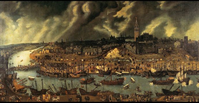 西班牙南部内河港口城市塞维利亚,古称巴罗斯港,图为西班牙塞维利亚画派著名画家牟里罗(B.E.Murillo,1617-1682)绘制的油画:西印度群岛舰队返航进入塞维利亚瓜达尔基维尔河。